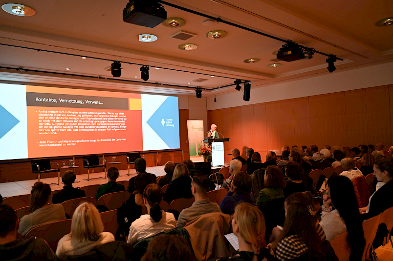 In ihrem Videogrußwort würdigte die Bayerische Staatsministerin für Familie, Arbeit und Soziales, Ulrike Scharf, die wichtige Arbeit der Beratungsstellen, die durch staatliche Mittel für Präventionskampagnen und Unterstützungsmaßnahmen gefördert werden. „Wir sind nicht ohnmächtig. Wir können das Unrecht des Menschenhandels bekämpfen. Dafür steht diese Fachtagung“, so Staatsministerin Scharf. Ein zentrales Instrument sei dabei die Prävention durch Sensibilisierung von wichtigen Akteuren wie Meldestellen. Scharf nahm allerdings auch den Bund in die Pflicht: Bestehende EU-Richtlinien müssen umgesetzt und ein nationaler Verweismechanismus eingeführt werden. Menschenhandel ist ein Geschäftsmodell Dr. Adina Schwartz von der Fachberatungsstelle „Jadwiga“ verdeutlichte, wie komplex der Kampf gegen Menschenhandel ist: Im letzten Jahr gab es einen Anstieg von 41% der Betroffenen in Europa. Menschenhandel ist heutzutage kein isolierter Straftatbestand mehr, sondern durch Netzwerke von über 800 Gruppen mit rund 25.000 Mitgliedern gestützt, die in verschiedenen Bereichen in die Gesellschaft hineinwirken. Statistiken zeigen, dass die Ausbeutung in Form von Arbeits- und sexueller Zwangsarbeit zunimmt und nahezu gleich häufig vorkommt. Zudem fehle es oft an strukturierten Daten zur Erfassung von Menschenhandelsfällen, was eine zielgerichtete Bekämpfung erschwere.